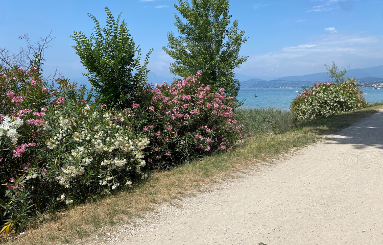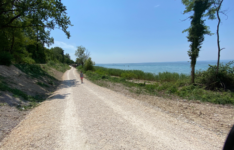 An der ersten Kreuzung biegen wir rechts ab, und etwa 100 Meter weiter finden wir ein Schild, das den See auf der linken Seite anzeigt. Wir nehmen einen Waldweg im Schatten der Bäume, der an heißen Tagen Erfrischung bietet und direkt zum Seeufer führt. Nach rechts geht es in Richtung Lazise ein Weg, der für alle geeignet ist und zu Fuß, mit dem Fahrrad oder mit Kinderwagen begangen werden kann.