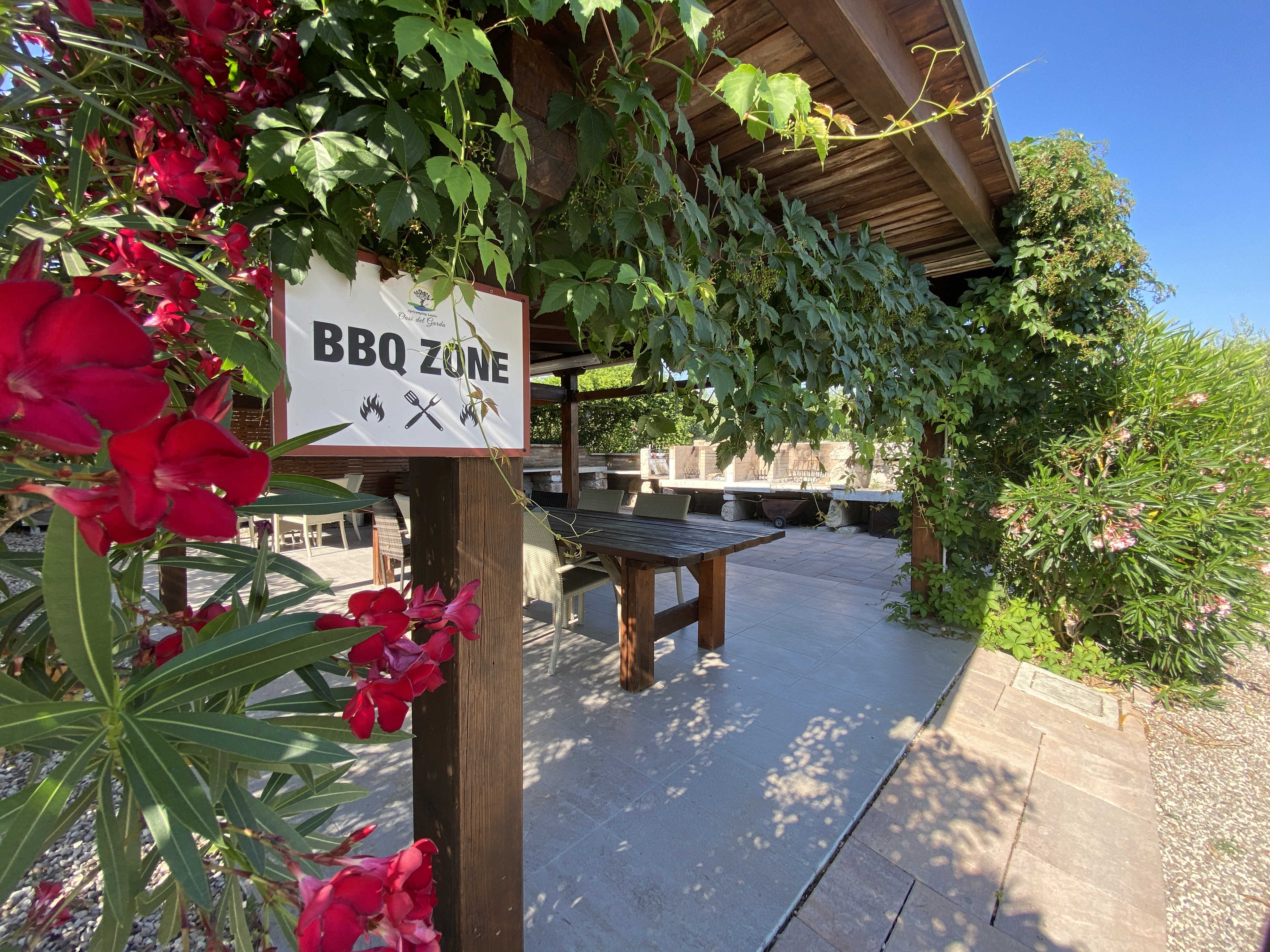 An under cover area with exposed beams boasts a large wooden table complete with chairs, adjacent to a work bench top, a sink and two barbecues and a small wood shed. The BBQ area can be utilised for barbecuing both during the day, and in the evening, since the area is illuminated. Here you can enjoy fun, outdoor dinners, cooking whatever foods you desire on the fire. The area is covered by wi-fi internet connection. The area is freely available to all agricamping guests.